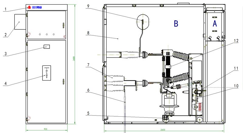 5 接地母线 6 进出线电缆 7 支持绝缘子 8 高压室